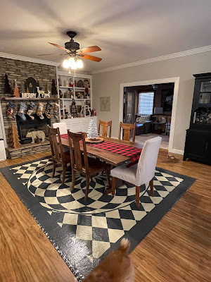 Just in time for Christmas I finished my new rug. Obviously, I love it, although I realize it may not be to everyone's taste (as I've been told). It was very special as well because I painted it while suffering from BPPV a form of vertigo and another unknown dizziness. I really struggled to finish before our new table arrived. When I work on a piece like this, I could continue to find mistakes and areas to correct and never stop. It is 100% hand drawn and painted.